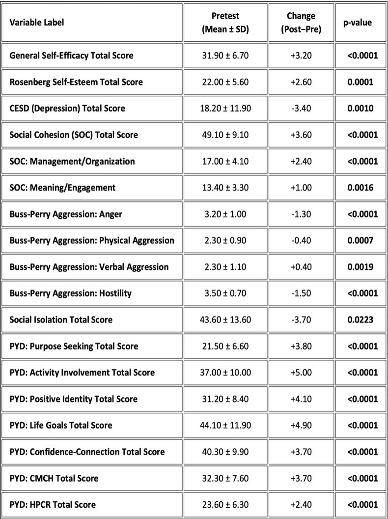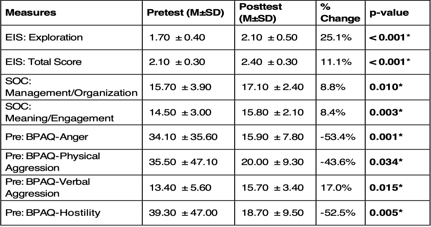 Behavioral Reductions: All aggression related measures (BPAQ-Anger, Physical Aggression and Hostility) showed Statistically significantly decreases in posttest. Notably, BPAQ-Verbal showed a slight increase.